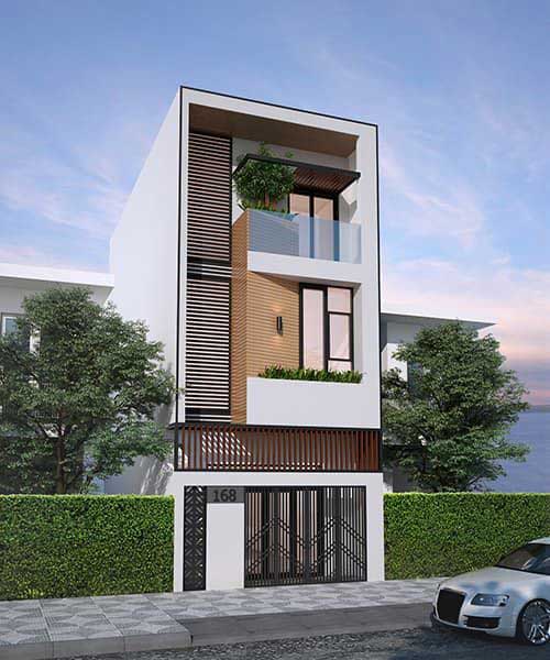 Với thiết kế hiện đại, ngôi nhà khoác lên mình vẻ đẹp sang trọng. Tường ốp giả gỗ nổi bật lên trên nền màu trắng, mục đích của viếc ốp đá giả gỗ là muốn ngôi nhà tăng tính thẩm mĩ, đồng thời khiến tường nhà sạch hơn. Cách thiết kế phần ban công tầng 2 khá độc đáo, 1 bên lõm sâu vào, tạo cảm giác thị giác, bên ngoài tận dụng trồng cây xanh, tăng không gian và giúp hài hòa căn nhà. Trên tầng 3 có bài trí lam gỗ giúp cân chỉnh ngôi nhà và thuận tiện cho việc trồng các loại cây leo.