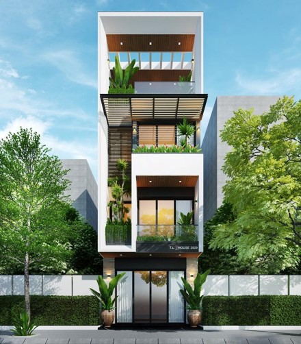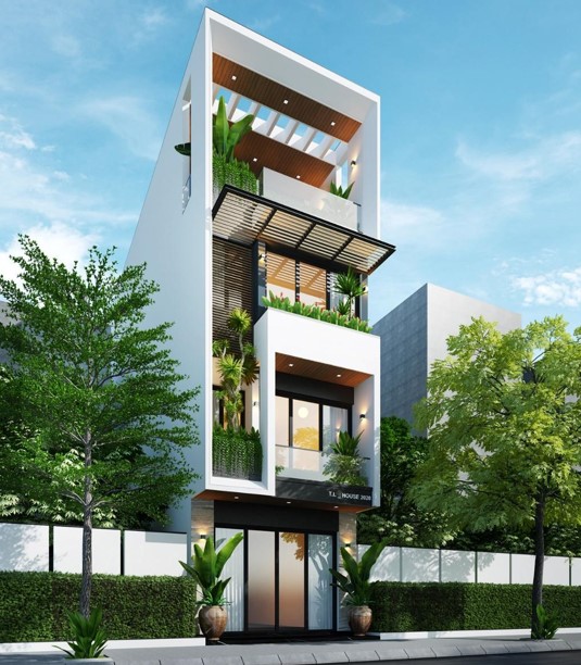 Việc mà kiến trúc sư xử lý mặt tiền của ngôi nhà, cùng các hình khối được tạo nên từ một cách thức khoa học. Thiết kế mang tính đồng bộ ở các vị trí cần thiết và đổi mới ở những điểm khác nhau tạo nên sự khang trang, nét đẹp gần gũi và tinh tế cho ngôi nhà mặt phố. Ngôi nhà được kết hợp với rất nhiều gam màu khác nhau nhưng nét chủ đạo được lấy từ màu trắng càng làm tăng sự tiện nghi hiện đại mà rất nhiều thiết kế ngày nay đã áp dụng để tạo nên sự thành công lớn cho cả một công trình.