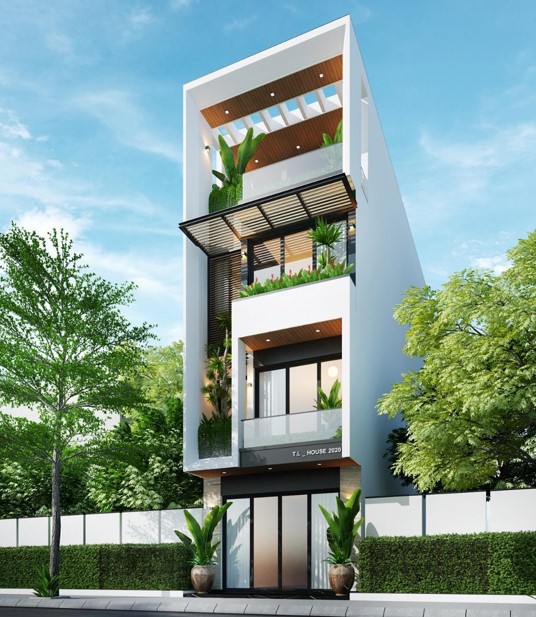 A. Phối cảnh mặt tiền ngôi nhà 1 trệt 3 lầu diện tích 5x20m :