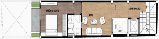 Mặt bằng tầng 2 : Với số lượng từ các thành viên trong gia đình không quá lớn nên các chức năng được giảm thiểu một cách tối đa. Mặt khác, các chức năng khác được san lấp vào các khoảng trống đó bằng một không gian thư giãn, 1 sản rộng, mà phía trước mặt tiền ngôi nhà được sử dụng như một phòng ngủ master với đầy đủ các chức năng.