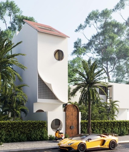 Từ góc nhìn trực diện của ngôi nhà, màu sắc chủ đạo mà kiến trúc sư mang đến không gì khác là một sắc trắng tươi mới. Phần cổng ra vào thể hiện từ nét cổ điển mà cửa sổ hình tròn phía bên trên có thể xoay vòng theo việc tận dụng không gian mà các thành viên có thể kết hợp. Kế tiếp là điểm nhấn từ chức năng tầng 1 mà làm cho nhiều người phải bất ngờ bởi vẻ ngoài của chúng như được “Bóc tách” ra khỏi từ mảng tường.