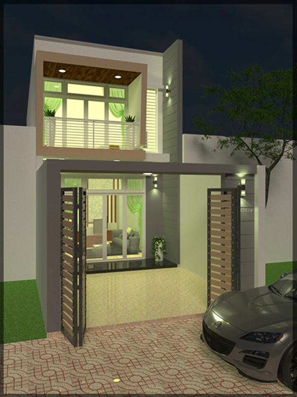 Căn nhà 2 tầng 5m có thiết kế tầng 1 khá đơn giản và tận dụng chủ yếu ánh sáng tự nhiên bên ngoài. Nguyên liệu chủ yếu sử dụng để lắp đặt hệ thống cửa là kính cường lực trong suốt nhằm mục đích đón nhận ánh sáng bên ngoài 1 cách tốt nhất. Để đảm bảo an toàn, còn lắp đặt hệ thống cửa sắt – cửa cổng, làm căn nhà trở nên hiện đại, năng động nhưng vẫn phát huy được những công năng tiện ích cho chủ hộ. Bên cạnh đó, căn nhà còn chú trọng đến việc đưa thiên nhiên vào trong không gian sống cho con người, mảng tường được thiết kế có lắp đặt chỗ để trồng cây, nhìn rất mới mẻ mà dễ chịu, phía trên ban công còn có một bồn cây dài để trang trí cho căn nhà thêm đẹp và lạ mắt. Nhìn tổng thể căn nhà khá hài hòa và trẻ trung, là kiểu nhà mà các hộ gia đình đang rất ưa chuộng hiện nay.