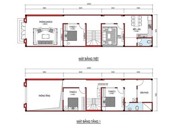 Mặt bằng thiết kế của mẫu nhà 2 tầng 5m: