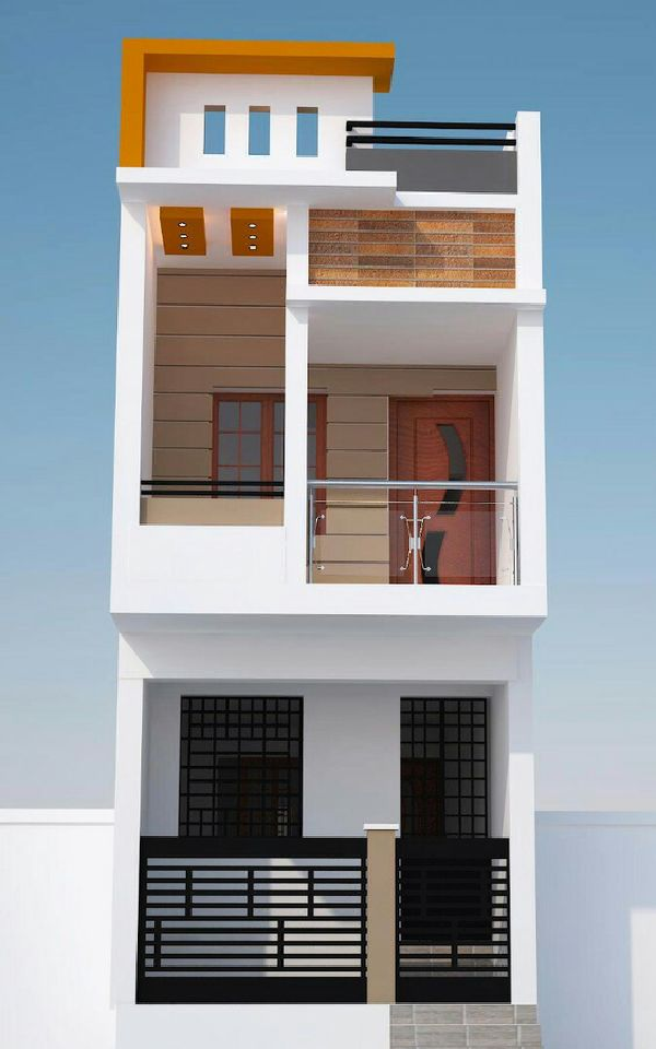 Mẫu thiết kế nhà đẹp thứ hai dành cho ngôi nhà 2 tầng 5m x 15m vẫn là phong cách xây dựng hiện đại đơn giản. Tại sao lại là đơn giản bởi ngay ở phần mặt tiền ngôi nhà không có bất cứ một hoa văn cầu kỳ nào, cũng không sử dụng bất cứ một kiến trúc cầu kỳ, chỉ đơn giản là việc sử dụng màu sắc khác biệt giữa hai tầng với nhau. Ở tầng 1 gam màu trắng, trung tính, lên đến tầng 2 sử dụng nâu lạnh, với sắc cam nổi bật vừa nổi bật lại vừa thu hút. Đây chính là mẫu thiết kế phổ biến, áp dụng rất nhiều ở khu vực nông thôn.