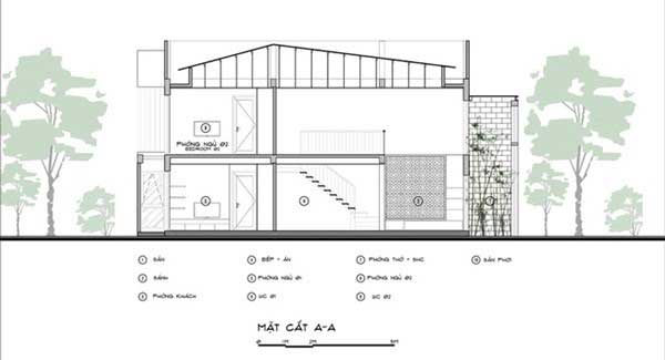 Mặt cắt dọc của căn nhà 5x14m, được bố trí và thiết kế rất tiện nghi, đảm bảo không gian sống và sinh hoạt thoải mái, tăng cao chất lượng sống cho gia đình.