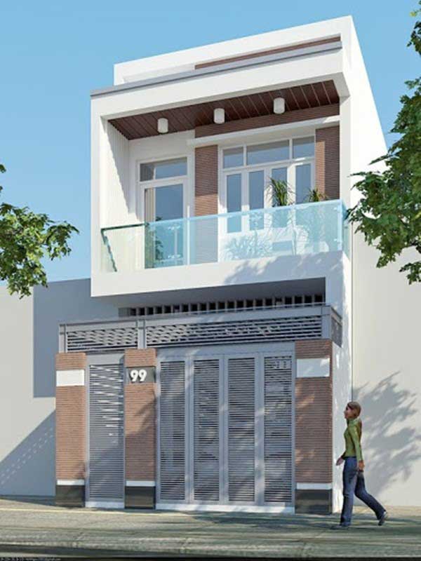 Với mặt tiền 5m và chiều sâu dài 14m, căn nhà ống 2 tầng được thiết kế kiến trúc với các mảng khối và bố cục được xử lí cực kì đơn giản. Mặt tiền cũng như khối ban công, hệ thống cửa sổ, cửa chính được xử lí sao cho đảm bảo không gian sống thông thoáng mà đón nhận được nhiều ánh sáng tự nhiên trong căn nhà. Lan can ban công thiết kế bằng kính cường lực chắc chắn, được bố trí bồn hoa tiểu cảnh với phần chân tường có lam nhựa giả gỗ, khối tường ốp đá chạy dọc và khoảng dầm đua rộng tạo điểm nhấn mới mẻ, độc đáo cho ngôi nhà. Gam màu sáng và be là màu chủ đạo của căn nhà, sự kết hợp ăn ý này cùng với các mảng màu trong các chi tiết ngoại thất khiến căn nhà trở nên hài hòa, đảm bảo được nét thẫm mỹ mà còn có thể giúp cuộc sống của các hộ gia đình trở nên thoải mái, chất lượng hơn.