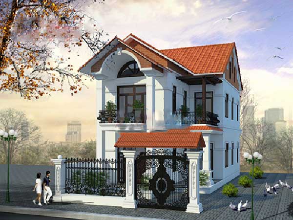 Kiến trúc tương tự ở mẫu trên, có điểm khác là sử dụng mái ngói thay cho mái bằng. Sử dụng mái ngói thiết kế chữ A, bao phủ toàn bộ bề mặt ngôi nhà, không gây hiện tượng quá đồ sộ về mặt thiết kế, phù hợp với diện tích sàn 70m2. Phần ngăn cách giữa không gian hai tầng cùng với cột trụ ở hàng rào cổng được sơn màu nâu sáng hơn. Ngói chọn màu sẫm phù hợp với tổng thể thiết kế. Với việc sử dụng phần mái, ngôi nhà này mang đến cảm giác cổ điển trong thiết kế.