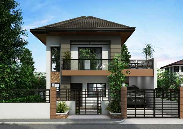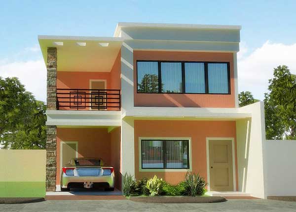 Mặt tiền cũng có kiến trúc khá giống với hai mẫu phía trên. Khu vực tầng hai gia chủ sử dụng 4 cánh cửa sổ nhỏ để có thể đón lấy ánh sáng cho căn nhà và không sử dụng ban công. Phần diện tích bên gara ô tô ở tầng hai đã sử mái che, ban công sắt sơn tĩnh điện đen tĩnh điện tạo nên không gian thông thoáng. Điểm nhấn là cột trụ ốp đá sần ở khu vực thứ hai này. Không gian nổi bật nhờ vào màu sắc nổi bật, phần nào đó nói lên chủ nhân của ngôi nhà có chút nữ tính, mơ mộng.