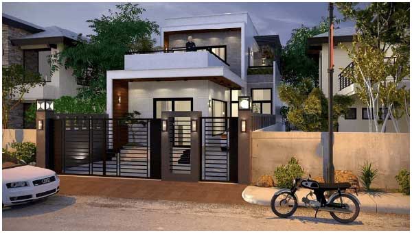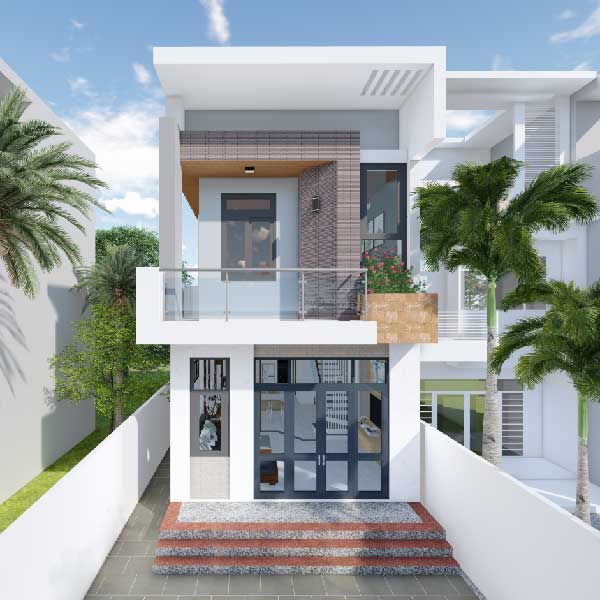 Mặt tiền với nổi bật hệ thống cổng rào với một bên cột trái sơn cam nâu đất, chiếu thẳng vào không gian này phía trong nhà với mặt tiền tầng 2 và tum cũng là màu tương tự - thiết kế đối chiếu ấn tượng. Phần bên phải cột cổng là ốp đá xám màu, ấn tượng sang trọng cùng với sự chắc chắn. Thiết kế lệch tầng được biểu hiện rõ với một bên diện tích hơi nho ra một chút và một bên diện tích lùi vào phía trong, với khoảng hở để làm bên ban công nhỏ cho khu vực tầng hai. Cộng với thiết kế cửa sổ tràn diện tích mang đến không gian thông thoáng, rộng rãi cho khu vực tầng hai của ngôi nhà. Bên trên khu vực tầng tum sử dụng thanh bê tông đặt ngang, sơn trắng với giàn cây leo xanh tạo nên khu vườn xanh, không gian nhà và thiên nhiên được hòa vào nhau một cách tự nhiên.