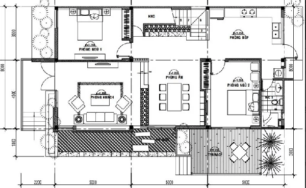 Tầng 1 bố trí với: 1 phòng khách, 2 phòng ngủ, 1 bếp, 1 phòng ăn, và 1 nhà vệ sinh. Ngoài ra bố trí khoảng sân vườn phía sau nhà để gia chủ có không gian xanh yên tĩnh, thữ giãn với bộ bàn ghế nhỏ.