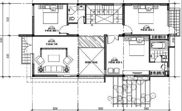 Tầng 2 với: 1 phòng thờ, 3 phòng ngủ trong đó 1 phòng ngủ master được bố trí nhà vệ sinh bên trong để đảm bảo độ riêng tư nhất định và 1 nhà vệ sinh chung giữa 2 phòng ngủ nhỏ hơn.