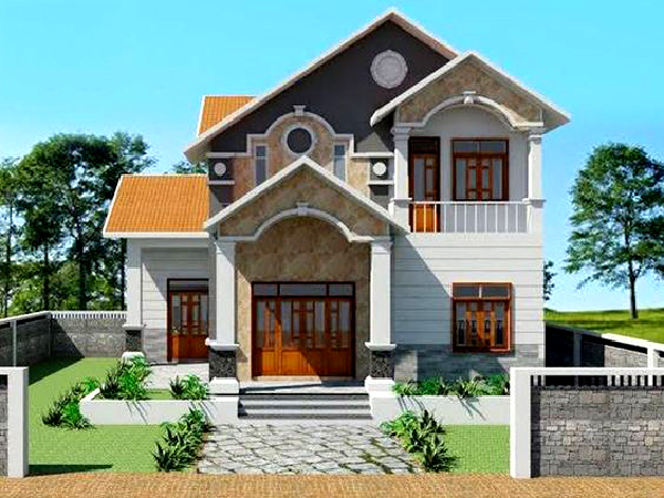 Nổi bật ngôi nhà này chính mặt tiền đươc ốp đá vàng nhạt, cùng hệ thống cột trụ vững chắc, mái vòm tiêu biểu cho những mẫu nhà châu Âu truyền thống. Hệ thống cửa kính hiện đại, nhưng sử dụng khung gỗ phù hợp với tổng thể của ngôi nhà. Mái thái lựa chọn ngói có màu gach nung đồng màu với tông màu tổng thể. Thêm một chút xanh của khu vườn xung quanh nhà nổi bật căn nhà với màu sắc khá rực rỡ, cuốn hút.