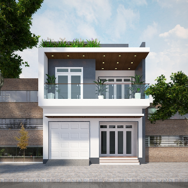 Nếu như không có hệ thống rào, gia chủ lựa chọn mẫu thiết kế như trên với kiến trúc đối xứng giữa các tầng nhà với nhau, đơn giản, không cầu kỳ. Sử dụng gam màu trắng ở tầng 1 cùng với màu sáng ở tầng 2, hệ thống trần nhà ốp gỗ sang trọng. Lan can sử dụng kính cường lực an toàn, dễ vệ sinh.