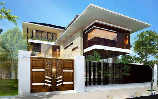 Mẫu nhà 2 tầng 8mx11m phong cách hiện đại ứng dụng mái Thái kết hợp sắc nâu sẽ mang đên sự lựa chọn sang trọng cho tổng thể. Màu nâu trong ngôi nhà xuất hiện khung cửa và nâu tối màu ở thiết kế mái. Thêm sắc xám xuất hiện ở gạch ốp ở cả hai tầng nhà cũng mang đến sự sang trọng trong lối kiến trúc hiện đại hiện nay.