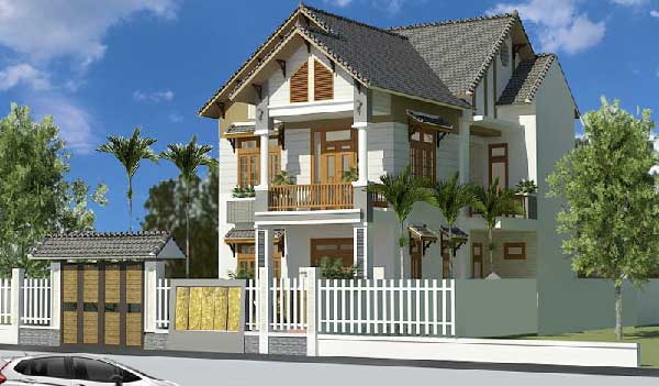 Thiết kế đối cứng được áp dụng cho hai tầng của ngôi nhà và chia thành hai diện tích: một bên là cửa chính bằng khung gỗ sang trọng, phần cột trụ vững chắc với phần chân sơn trắng và phần thân làm nhám ấn tượng. Phần còn lại mặt tiền là hệ thống cửa sổ kết hợp mái phía trên cùng với ánh sáng cực kỳ sang trọng cuốn hút. Phần mái nhà áp dụng kiến trúc áp mái để gia tăng diện tích sử dụng trong nhà. Bên ngoài là hệ thống cổng rào bao quanh với phần mảng tường với kiến trúc mang đậm phong cách châu Âu.