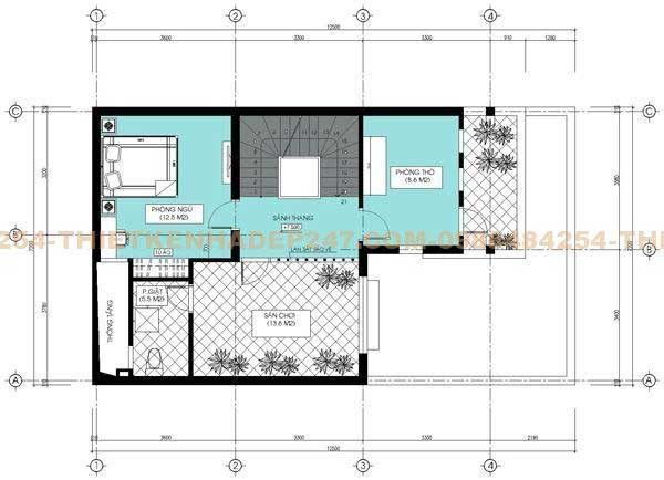 Tầng 2 của mẫu nhà 2 tầng 8mx11m được bố trí chia thành hai không gian giống như tầng 1. Với một bên là sân chơi rộng rãi và nhà vệ sinh kết hợp với phòng giặt và phơi đồ, sau cùng là khu vực thông tầng. Bên kia là ban công nhỏ phía trước sau đó là phòng thờ, sau đó khu vực cầu thang và cuối cùng là một phòng ngủ.