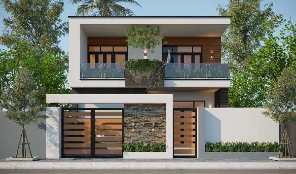 Mẫu nhà 2 tầng 8mx11m với phong cách hiện đại sử dụng khối hộp để tối ưu được diện tích sử dụng bên trong nhà. Mặt tiền tầng 1 được che kín bởi hệ thống cổng rào phía bên ngoài nhà và chia thành hai diện tích đối chiếu lên bên trong nhà ứng với hai mặt tiền. Tone trắng với phần viền khung kết hợp ô cuear kính khung sơn đen và gạch ốp giả gỗ mang lại sự sang trọng. Giữa nhà được gia chủ tạo điểm nhấn với cổng là tường ốp giả gạch, chậu cây xanh đi theo, lên trên tầng hai là chậu cây lớn kết hợp tạo không gian xanh cho ngôi nhà.