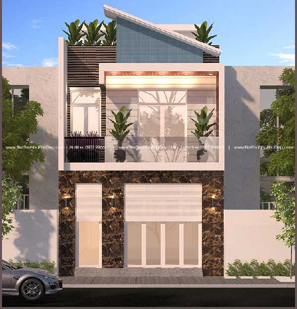 Khu vực tầng 2 được ốp đá nhám ấn tượng quanh khung cửa sổ, còn với khu vực cửa chính dẫn ra ban công sử dụng lớp chỉ phào nhẹ để tạo điểm nhấn, tránh gây nhàm chán. Phần kiến trúc mái sử dụng méo xéo kết hợp kiến trúc tum đẹp mắt.