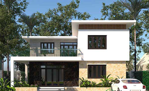 Nhẹ nhàng mà đơn giản, mẫu nhà 2 tầng 90m2 này được thiết kế đơn giản nhất có thể. Nó là được thiết kế theo dạng bậc thang, chiều cao của ngôi nhà khiêm tốn, mái bằng đơn giản giúp tiết kiệm chi phí hiệu quả. Ban công được lớn với lan can bằng kính mang đến một khoảng sân lý tưởng đón chào bình minh mỗi ngày.
