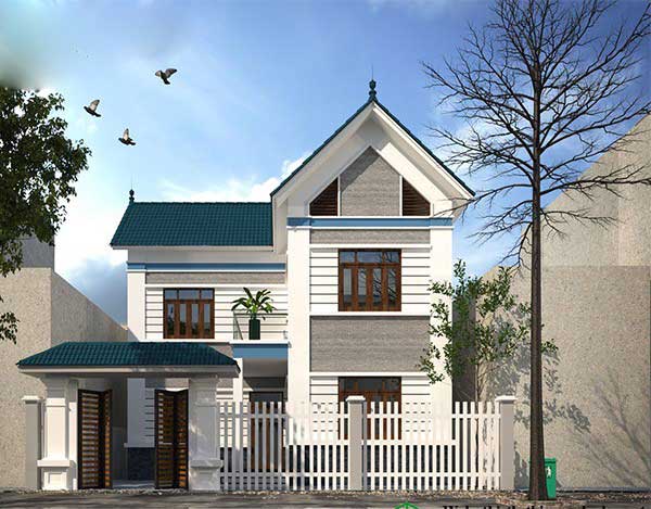 Mẫu nhà hai tầng 90m2 này được thiết kế giống như một biệt thự thu nhỏ. Nó bao gồm có hai cửa, hàng rào bảo vệ làm lộ kiến trúc của ngôi nhà. Kiểu mái Thái đơn giản, kết hợp với vật liệu gỗ cho thấy chủ nhân của nó yêu thích sự sang trọng và có điều kiện kinh tế vô cùng tốt. Mẫu nhà này cũng được thiết kế thêm gara oto thuận tiện cho việc di chuyển.