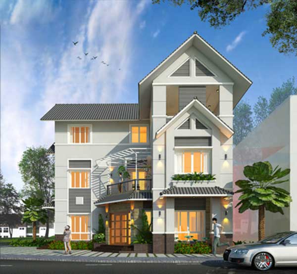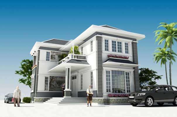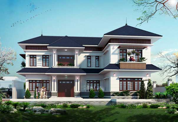 Mẫu nhà 2 tầng dáng chữ L được thiết kế theo phong cách hiện đại, sang trọng với hình thức cột làm điểm nhấn và đi bên cạnh đó lầ 2 màu sắc chủ đạo là màu trắng của ngôi nhà và màu xanh của mái. Mái màu xanh và có độ dốc lớn sẽ giúp cho ngôi nhà được thoáng mát vào mùa hạ và thoát nước nhanh vào mùa mưa. Việc làm mái ngói sẽ hơi tốn kém và mất công nhưng mang lại tính thẩm mỹ cao cho ngôi nhà và sự chắc chắn. Bao bọc xung quanh ngôi nhà là cây cối, điều này giúp cho ngôi nhà được gần gũi với thiên nhiên hơn, tạo cho người sử dụng có cảm giác thoải mái và dễ chịu.