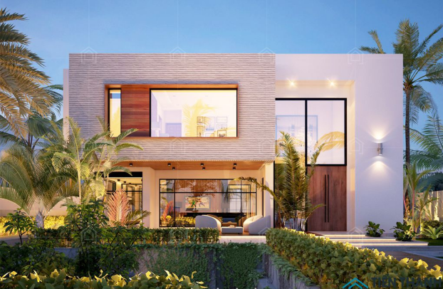 Lựa chọn thiết nhà nhà 2 tầng mái bằng phổ biến và sáng tạo khi sắp xếp các khối hình học trong cấu trúc của ngôi nhà đã làm nên một thiết kế thật sự ấn tượng. Gạch lát ốp toàn bộ mặt ngoài mang hoa van vân gỗ với cây xanh được trang trí xen kẽ giữa không gian trống đã kết hợp tạo nên một vẻ đẹp hài hòa, gần gũi.