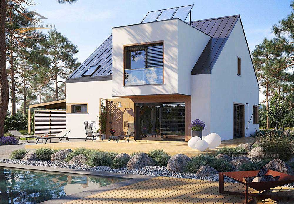 Đây chắc chắn sẽ là một ngôi nhà nổi tiếng nếu được xây dựng ở các vùng nông thôn khi bạn có điều kiện kinh tế dư giả và đưa yếu tố nghỉ dưỡng, thẩm mỹ lên hàng đầu. Một không gian sống tích hợp đầy đủ các không gian nghỉ ngơi, vui chơi, thư giãn và cả làm việc. Không gian sinh hoạt chính của ngôi nhà được thiết kế trong cùng, mái hiên phía trước được kéo dài tạo thành khu chòi nghỉ cho bể bơi bên cạnh, mặt bên còn lại được sử dụng làm bãi đỗ xe và thiết kế vườn tược nhỏ xinh phục vụ cho cuộc sống hàng ngày.