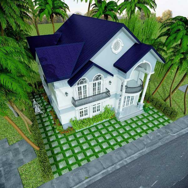 Ở mẫu nhà 2 tầng lợp mái tôn này, màu sắc của mái lợp tôn chính là một điểm nổi bật, tạo sức hút cho toàn bộ căn nhà. Ngôi nhà được thiết kế theo lối kiến trúc tân cổ điển với những mái vòm tinh tế và chi tiết, kết hợp không gian xanh tạo cảm giác thoải mái, dễ chịu.
