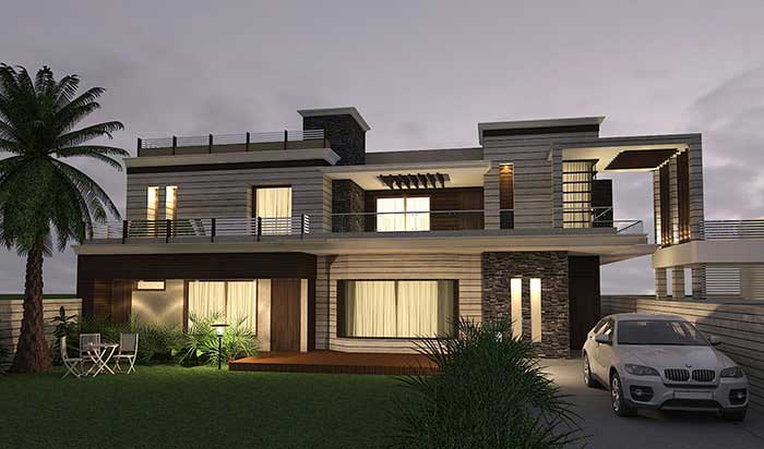 Một mẫu thiết kế nhà 2 tầng mái bằng hiện đại thường thấy ở nước ta. Đây là phong cách thiết kế hiện đại kiểu Mỹ vô cùng đẹp mắt khi cấu trúc của căn nhà không tuân theo bất cứ quy chuẩn thông thường nào. Không gian nhà thoáng mặt tiền hướng ra đường, nhà 2 tầng mái bằng hiện đại này có kiểu dáng, kích thước mà mỗi tầng đều được thay đổi khối hình học rất linh hoạt cũng như không thể nhận thấy rõ sự phân cách giữa các tầng nếu như chỉ nhìn từ bên ngoài. Tone màu trắng-nâu nhạt chủ đạo và các loại cây cối được lựa chọn trong phảng phất trong cách thiết kế địa trung hải.
