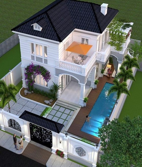 Việc tận dụng khoảng trống của sân làm hồ bơi tạo cho ngôi nhà thêm sang trọng, biến ngôi nhà thành 1 nơi nghỉ dưỡng lý tưởng. Ngôi nhà có thiết kế sang trọng, lịch lãm, kết hợp với cây cối mang lại cảm giác thư thái, dễ chịu. Sáng tạo nên vòm hoa ôm lấy cửa sổ cũng thật tuyệt vời, sinh động. Trên tầng 2 có 1 khoảng làm lam chắn, cho cây leo lên. Tăng không gian xanh cho ngôi nhà. Cổng được thiết kế hoa văn đẹp mắt, tinh tế, sang trọng.