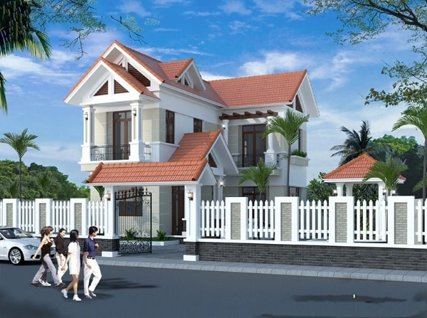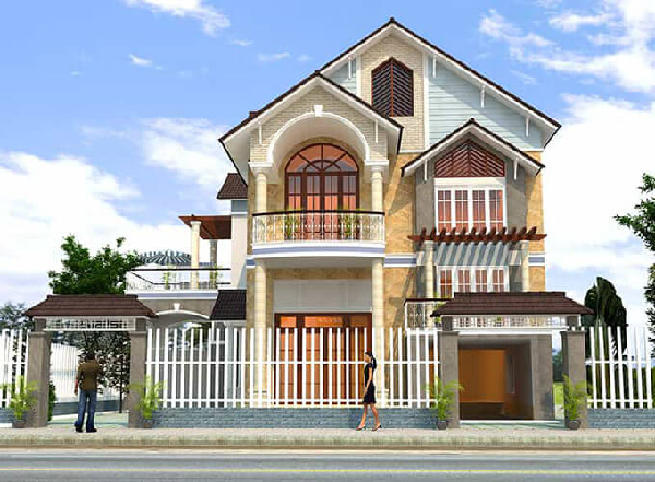 Sử dụng lỗi kiến trúc đối xứng tầng trên tầng dưới. Bên dưới tầng 1 là cửa chính bằng gỗ hoàn toàn tự nhiên với những nét họa tiết tinh xảo kết hợp cùng hai cửa sổ vòm ấn tượng. Lên phía tầng 2 với 3 ban công đặt tại 3 vị trí cửa tương ứng với ba không gian bên trong, nổi bật là ban công vòm ở giữa, ban công 2 bên được đặt chậu cây phù hợp. Kiến trúc mái hình thang, lựa chọn màu ngói xanh thẫm kết hợp kiến trúc giả tầng áp mái đã hoàn chỉnh vẻ đẹp của mẫu nhà mang đậm kiến trúc Pháp.