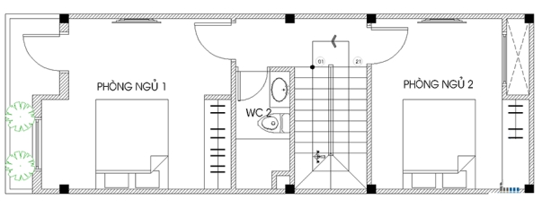 Vì là sàn lệch tầng nên các phòng sẽ không đảm bảo cân đối và thẳng nhau kể cả tầng 2 và tầng 3 cũng vậy. Lên đến mặt bằng tầng 2 gia chủ tập trung bố trí làm khu vực phòng ngủ của các thành viên. Phần sàn thấp được chia làm hai phòng ngủ của con cái và một phòng vệ sinh sử dụng chung ở cuối dãy tầng. Còn phần sàn cao được thiết kế làm phòng ngủ của bố mẹ với nhà vệ sinh khép kín bên trong tiện lợi.