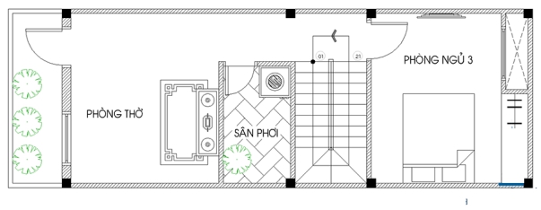 Trên tầng 3 cũng được chia làm hai khu vực chính. Phần hướng ra ngoài được làm phòng thờ trang trọng, thoáng sáng và là phòng cao nhất trong nhà. Ngoài ra phần diện tích còn lại để làm một phòng ngủ vừa và một sân phơi nhỏ.