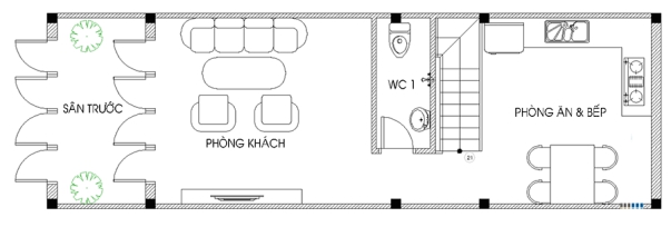 Mặt bằng tầng 1 gồm hai gian chính là phòng khách rộng rãi, thiết kế hiện đại và tối giản được tính toán phù hợp với hướng nhà, hướng cửa. Tiếp theo bên trong là nhà bếp, khu này chiếm diện tích lớn nhất vì nó còn được chia thành các phòng nhỏ hơn như: phòng ăn, nhà vệ sinh phụ, bếp nấu.