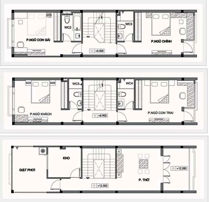 Nhìn tổng quan bản vẽ ta thấy hệ thống cầu thang của ngôi nhà có thiết kế giống nhau và theo một trục thẳng rất thuận tiện cho việc lắp đặt lan can và nhìn thông lên được các phòng. Ngoài ra cách phân bố các khu vực, chia phòng cũng cân đối phù hợp. Vậy nên khi nhìn vào bản vẽ ta thấy được sự vuông vức, gọn gàng mà không phải công trình nào cũng làm được. Do vậy tuy diện tích nhỏ nhưng biết cách bố trí sắp đặt thì gia chủ và tất cả các thành viên trong gia đình đều luôn cảm thấy hài lòng vì nó được phát huy tối đa công năng sử dụng.
