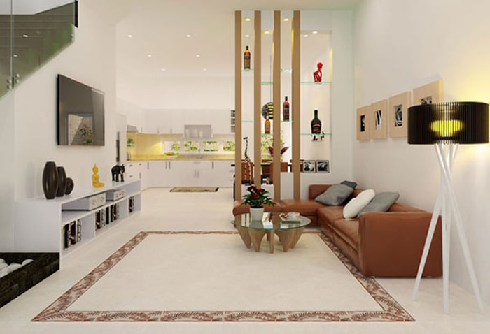 Ở tầng 1. Gia chủ dành riêng một khoảng diện tích rộng nhất để làm phòng khách. Với mặt tiền 4m tuy không quá lớn song nhờ sự thiết kế khéo léo mà phòng khách vẫn đáp ứng đầy đur công năng sử dụng của nó. Một bộ bàn ghê dài rộng, một chiếc kệ đặt ti vi to thêm những bức tranh lớn là yếu tố giúp phong khách như được mở rộng thêm. Chứ kể đến cửa chính đối diện với nó là mẫu cửa 4 cánh đủ dài, rộng để tôn thêm khoảng không của phòng. Đằng sau phòng khách được bố trí làm nhà bếp với đầy đủ bàn ăn, bếp ăn và một nhà vệ sinh phụ nhỏ. Trong nhà bếp có một cửa sổ nhỏ để thoát khí ra bên ngoài giúp căn phòng luôn thoáng đãng không bị ám mùi thức ăn.