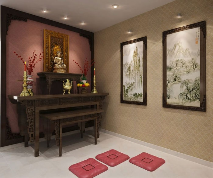 Và mội khu phòng nữa không thể thiếu trong đời sống văn hoá tinh thần Việt đó chính là phòng thờ, nơi tưởng nhớ về cội nguồn ông bà tổ tiên. Phòng thờ ở đây được thiết kế trang nghiêm theo lối kiến trúc truyền thống với sập ngụ, tủ gỗ, án hương, cả không gian từ trần nhà, vách ngăn, cánh cửa đến tất cả đồ dụng vật dụng đều thuần bằng gỗ màu gụ và chất lượng. Đôi lộc bình cao hai bên là hình ảnh muôn đời của dân tộc ta trong tục thờ cũng cũng được gia chủ đưa vào rất cẩn trọng. Chiếc đèn trang trí ánh vàng họa tiết cổ điển càng tôn thêm màu sắc tâm linh.
