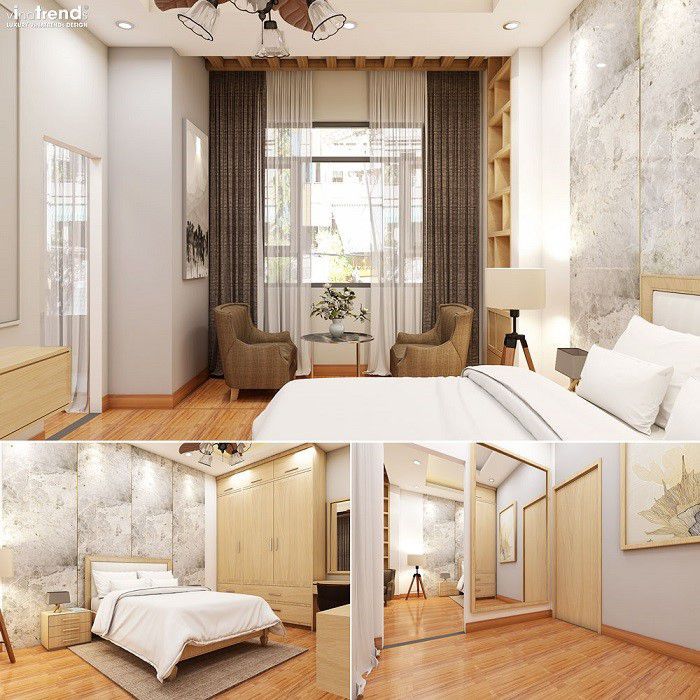 Tiếp theo là hình ảnh về nội thất phòng ngủ của mẫu nhà 3 tầng có gara oto bên trong. Đối với không gian phòng ngủ được nhà kiến trúc sử dụng tông màu sáng giúp cho căn phòng thêm sáng và thông thoáng hơn. Tất cả nội thất bên trong căn phòng ngủ đều được gia công và làm từ nguyên liệu gỗ sồi trong tự nhiên. Đây là một vật liệu thông dụng để làm nên bàn ghế hay giường tủ thiết kế trong nhà. Việc kết hợp gương trắng trong phòng ngủ là một giải pháp giúp ăn gian không gian diện tích trong phòng. Ngoài ra chính sự kết hợp này đã mang lại không gian thông thoáng cho căn phòng của bạn.