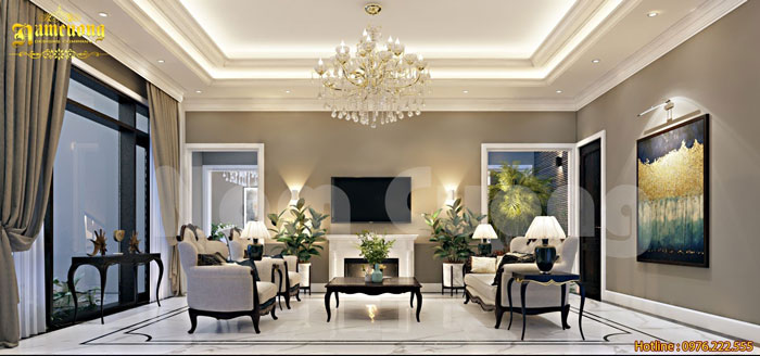 Hình ảnh tiếp theo về mẫu mặt bằng tổng thể nội thất phòng khách được thiết kế theo phong cách tân cổ điển, phong cách tân cổ điển là phong cách với sự kết hợp của cổ điển với hiện đại tạo nên sự mới mẻ trong thiết kế nhưng vẫn giữ được vẻ đẹp cổ điển. Không gian phòng khách với tông màu trầm tôn nên giá trị vẻ đẹp cùng chất lượng của đồ nội thất.