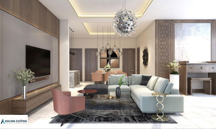 Mẫu thiết kế nội thất phòng khách với sự xuất hiện của bộ đèn chùm trang trí trần như mang đến ánh sáng lung linh cho căn phòng thêm phong phú hơn. Vẻ đẹp của căn phòng được tô điểm thêm nhờ tông màu trắng sữa của bộ bàn ghế sofa, tuy nhiên sự có mặt của bộ ghế cùng chiếu sàn đã mang đến vẻ đẹp lịch lãm cho ngôi nhà.