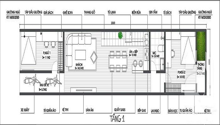 Từ phối cảnh trên hình cho chúng ta những thông số về diện tích các phòng với công năng khác nhau và kí hiệu các phòng rõ ràng. Ngôi nhà được thiết kế bố trí công năng các phòng tầng 1 như sau: Đầu tiên là khu để xe của gia đình đi vào trong chúng ta bắt gặp ngay căn phòng truyền thống của gia đình Việt chính là phòng khách có diện tích là 145m2, cùng không đó được phân chia bởi bàn quầy ngăn cách cùng với sự bố trí của gian bếp với đầy đủ các nội thất bếp phục vụ nhu cầu sinh hoạt cho gia đình. Không gian tầng 1 của nhà 3 tầng diện tích 4x20 m2 được bố trí hai phòng ngủ và một nhà vệ sinh chung. Các nội thất trong tầng được thiết kế sắp xếp gọn gàng ngăn lắp trong không gian nhà.