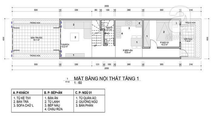 Mặt bằng tổng thể nội thất mẫu nhà 3 tầng diện tích 4x20 m2