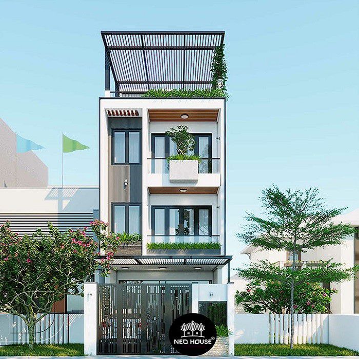 Mẫu thiết kế sau đây rất sang trọn đẹp và rất tinh ý, có thể nói là rất sáng tạo khi sử dụng màu trắng cho ngôi nhà. Bởi lẽ màu trắng còn được gọi là màu ăn gian diện tích cho tất cả các ngôi nhà. Khi sử dụng màu sơn trắng cho không gian nhà thêm sáng sủa và thêm rộng mở hơn. Đây cũng là màu sơn được giới trẻ yêu thích là chọn làm màu nền cho nhà. Mang lại không gian xanh cho ngôi nhà có sự chung sức của hệ thống cây cảnh bao quanh nhà làm tôn nên vẻ đẹp hay nâng cao giá trị thẩm mỹ cho nhà 3 tầng kính cường lực mái chéo.