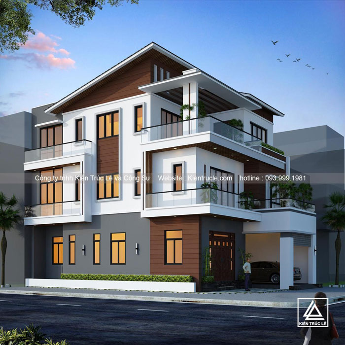 Phối cảnh bản vẽ mẫu nhà 3 tầng mái lệch đẹp hút mắt người nhìn