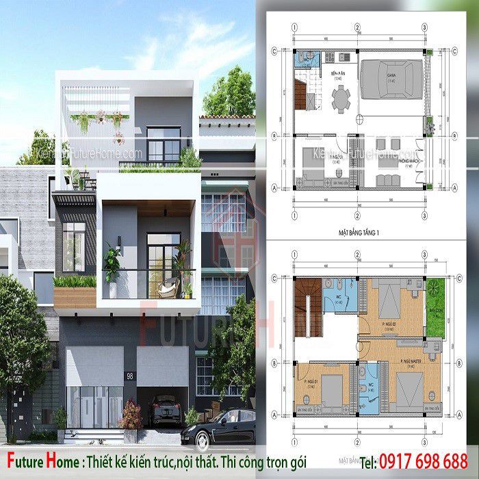 Phối cảnh bản vẽ nhà 3 tầng mặt tiền 7m đẹp sang chảnh.
