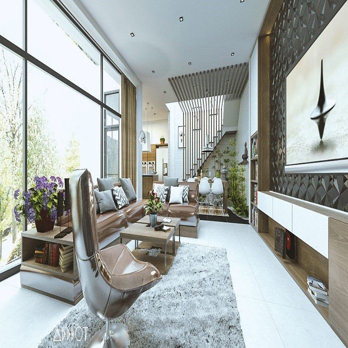 Mẫu thiết kế nội thất mà bạn đang được chiêm ngưỡng trên bài là một mẫu thiết kế nội thất đặc biệt cho ngôi nhà 3 tầng mặt tiền 7m. Với phong cách thiết kế hiện đại sang trọng mang đến ngôi nhà không gian thoáng mát và huy hoàng. Không gian phòng khách được kết hợp gần liền với phòng bếp và nhà ăn. Mang đến không gian tiện nghi và thống nhất cho mẫu nhà mặt tiền 7m này. Nội thất bàn ghế và kệ ti vi được gia công hoàn toàn từ gỗ tự nhiên. Không chỉ có bàn ghế mà ngay cả những thanh cầu thang đều được làm từ gỗ gia công qua sơ chế. Tất cả những thiết kế này mang tính thống nhất đồng bộ và mang đến vẻ đẹp sang trọng cho ngôi nhà.