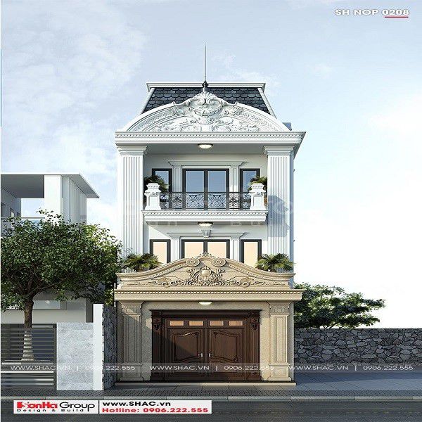 Mẫu nhà 3 tầng tân cổ điển này được tạo ra từ cảm hứng và sự sáng tạo trong thiết kế của mỗi kiến trúc sư. Theo như yêu cầu của gia chủ và các thành viên trong gia đình thì phong cách nhà thiên về cổ điển nhiều hơn nhưng chỉ cần một điểm nhấn nhẹ nhàng và thanh cao cũng đủ giúp cho nhà phố tân cổ điển thêm nổi bật và ngọt ngào hơn. Mẫu thiết kế nhà 3 tầng tân cổ điển rất cân xứng và đăng đối tổng thể toàn ngôi nhà.