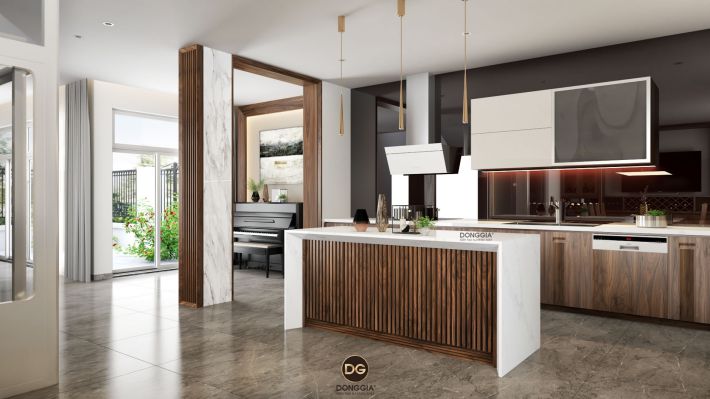 Phòng bếp là nơi sáng tạo ra những món ăn ngon, nơi gia đình sum họp với những bữa ăn đầy ắp tiếng cười nên có thể thiết kế đem lại cảm giác đầm ấm, êm đềm. Được bao phủ chủ đạo bởi màu trắng kết hợp với hệ thống tủ bếp gỗ treo tường mang đến sự hài hoà về mặt không gian. Có thể ốp thêm những viên gạch sinh động về màu sắc để tạo điểm nhấn cho căn bếp nhà bạn. Giữa phòng bếp là một bộ bàn ăn đơn giản nhưng vẫn thể hiện sự sang trọng.