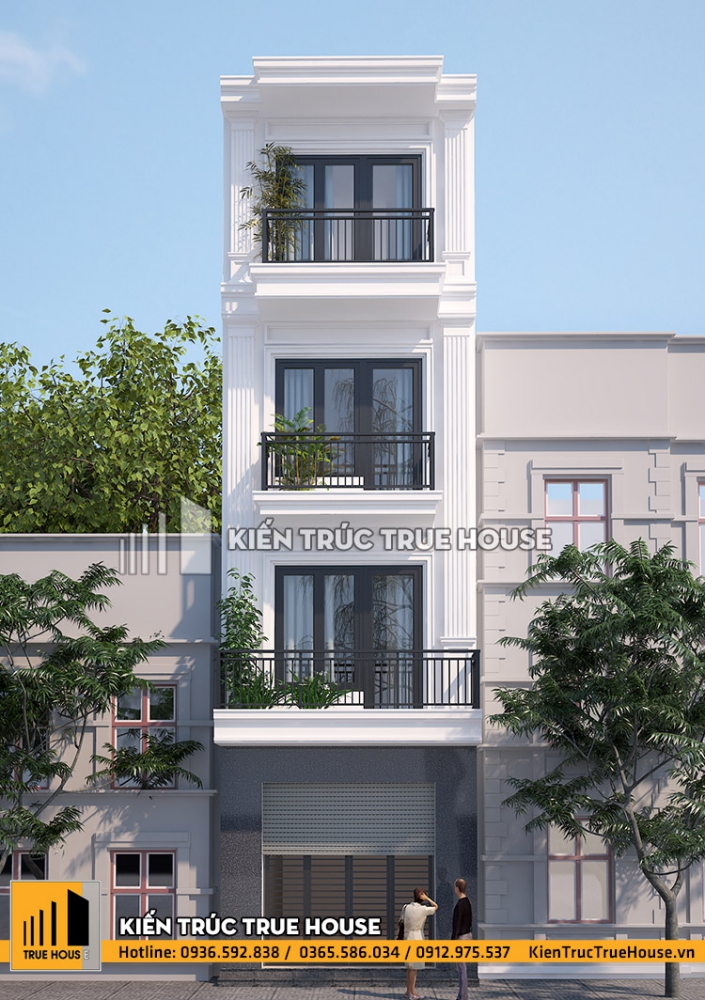 Từ xa nhìn lại, tổng thể căn nhà được phân chia giữa các tầng tạo nên sự hài hoà, cân đối cho căn nhà. Với lối thiết kế đơn giản, những hình khối trụ cột vuông vắn, khoẻ khoắn tạo cho ngôi nhà vẻ bề thế, kiên cố. Hệ thống ban công và lan can hình vòm được phun sơn tĩnh điện cùng các đường phào chỉ và hoạ tiết hoa văn được thiết kế chìm trên các bức tường tạo điểm nhấn cho mẫu nhà 4 tầng. Các đường phào chỉ trước đây được làm bằng thạch cao chống thấm và xi măng nhưng hiện nay đã có một số gia đình sử dụng chất liệu composit với nhiều ưu điểm hơn.