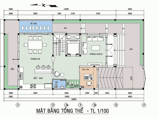 Tầng 1: Ngay sau lớp cửa chính là phòng khách, phòng làm việc và sâu vào bên trong của ngôi nhà là phòng bếp kết hợp là nhà ăn. Với những ngôi nhà có diện tích lớn như này có thể thiết kế thang máy để sinh hoạt dễ dàng lên các tầng. Những lúc cần bê đồ nặng lên tầng thì sử dụng thang máy sẽ khiến việc này trở nên dễ dàng hơn rất nhiều. Ngoài ra vẫn thiết kế tầng thang bộ ở chính giữa nhà ngăn cách phòng khách và nhà bếp.
